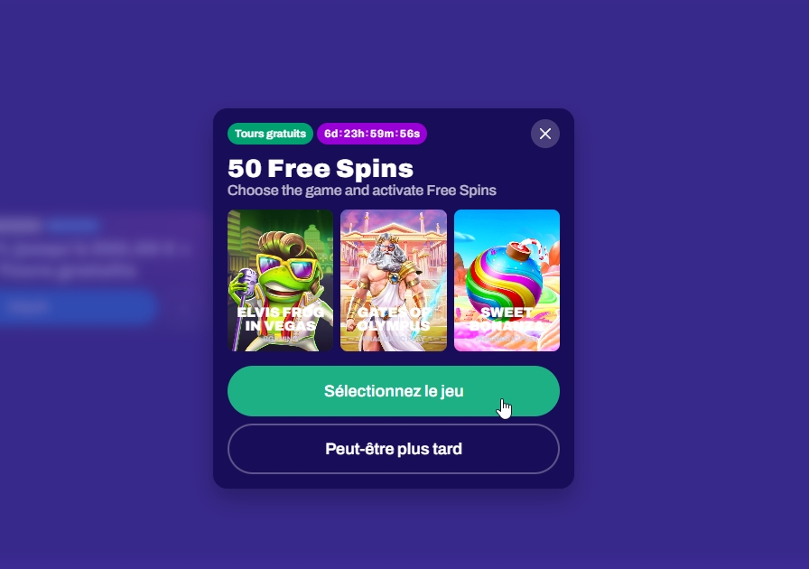 ✅ Recevoir 50 tours gratuits sur Sweet Bonanza, Elvis Frog in Vegas ou Gates of Olympus
