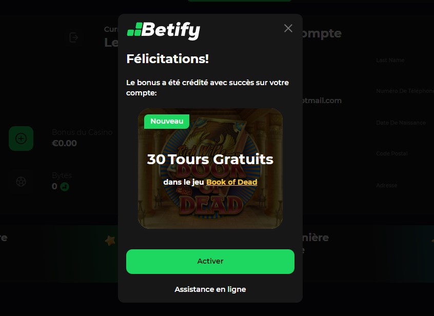 BETIFY | 30 tours gratuits | Code Napoleon30 à l’inscription ; vérification KYC (≈ 2 min) ; sur Book of Shadow. |